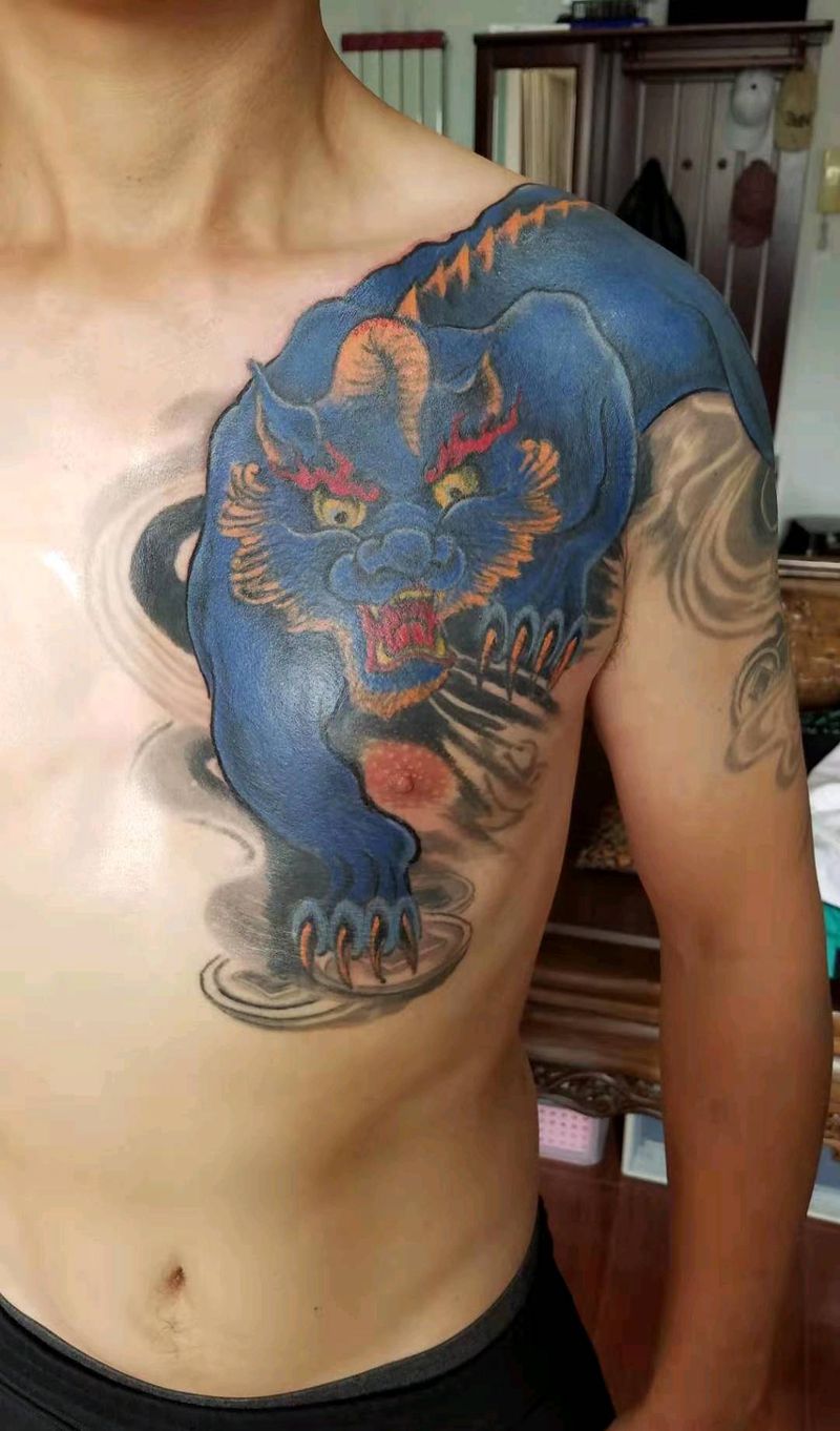 当前位置: 首页 >山东省威海市纹身店-梵天彫和纹身工作室纹身图案>貔貅,修改补色纹身图片_胸部肩部新传统纹身图案