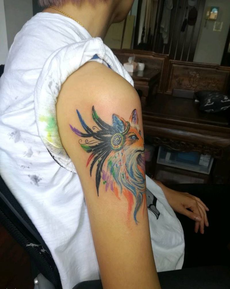 当前位置: 首页 >山东省威海市纹身店-梵天彫和纹身工作室纹身图案>狐狸纹身图片_肩部手臂水彩纹身图案