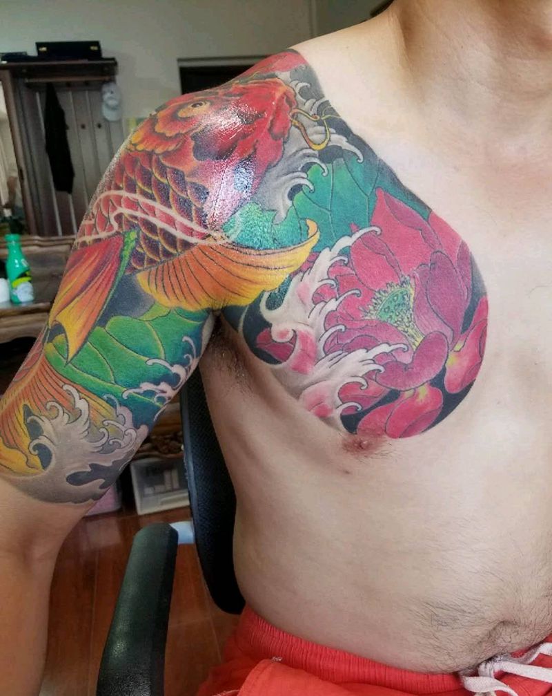 当前位置: 首页 >山东省威海市纹身店-梵天彫和纹身工作室纹身图案>重彩半甲纹身图片_肩部手臂新传统纹身图案