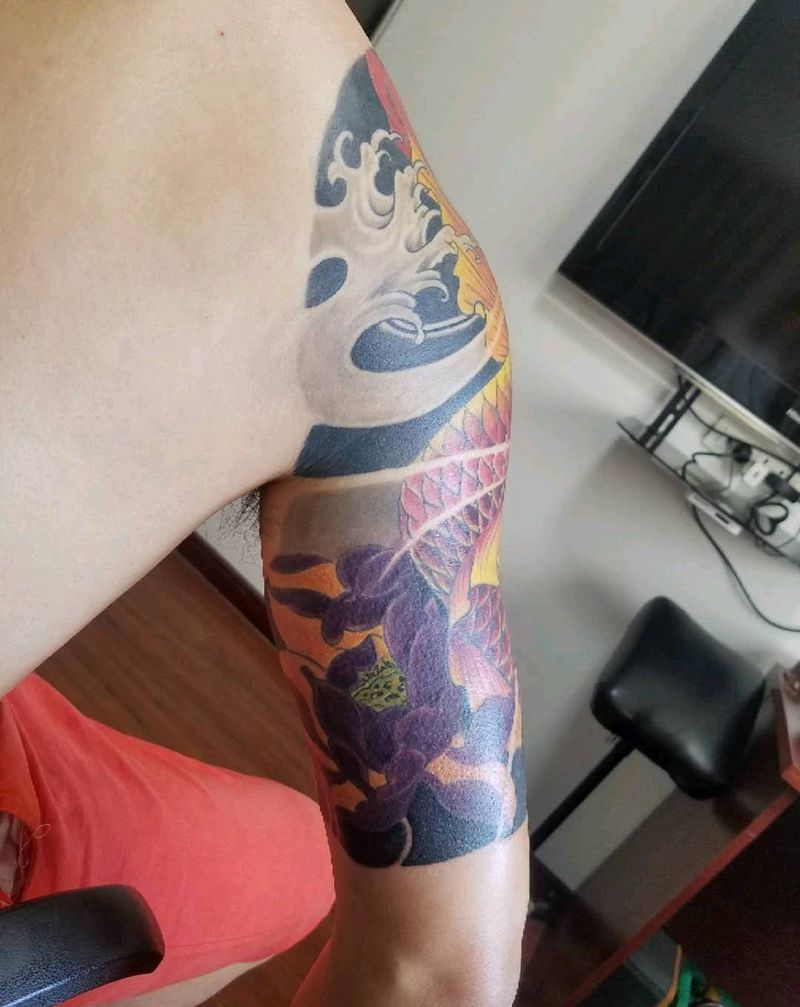 当前位置: 首页 >山东省威海市纹身店-梵天彫和纹身工作室纹身图案>重彩半甲纹身图片_肩部手臂新传统纹身图案