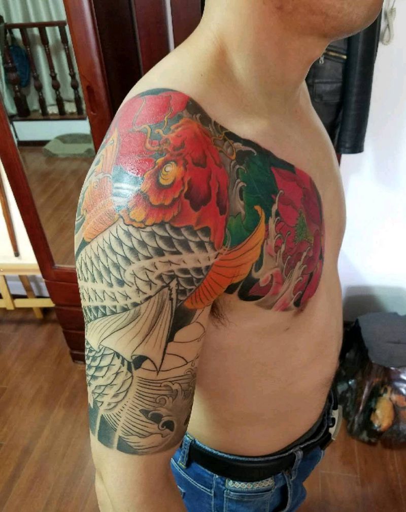 半甲魚纹身图片_胸部肩部新传统纹身图案