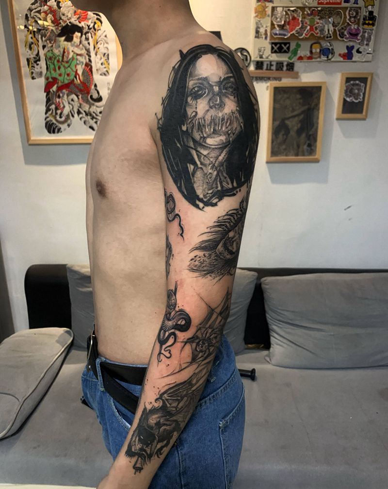 当前位置: 首页 >山东省日照市纹身店-人皮商刺青纹身图案>暗黑拼接纹身图片_手臂欧美写实纹身图案