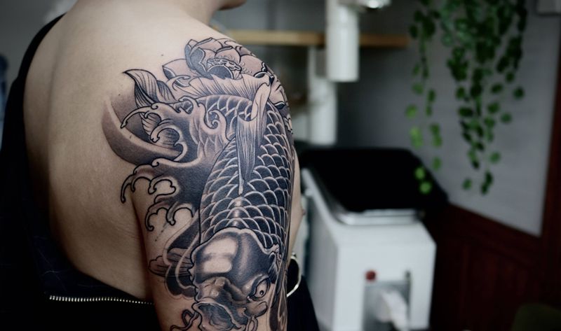 当前位置: 首页 >山东省日照市纹身店-赤焰阁纹身工作室纹身图案>遮盖纹身图片_手臂新传统鲤鱼纹身图案