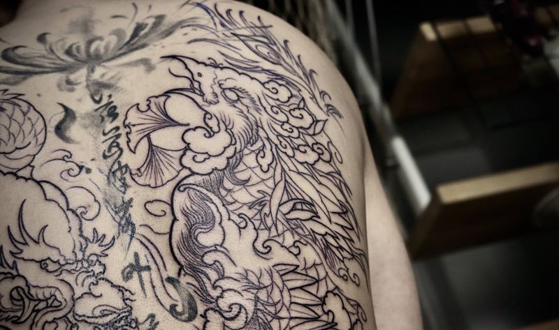 当前位置: 首页 >山东省日照市纹身店-赤焰阁纹身工作室纹身图案>龙凤呈祥纹身图片_背部新传统龙凤凰纹身图案