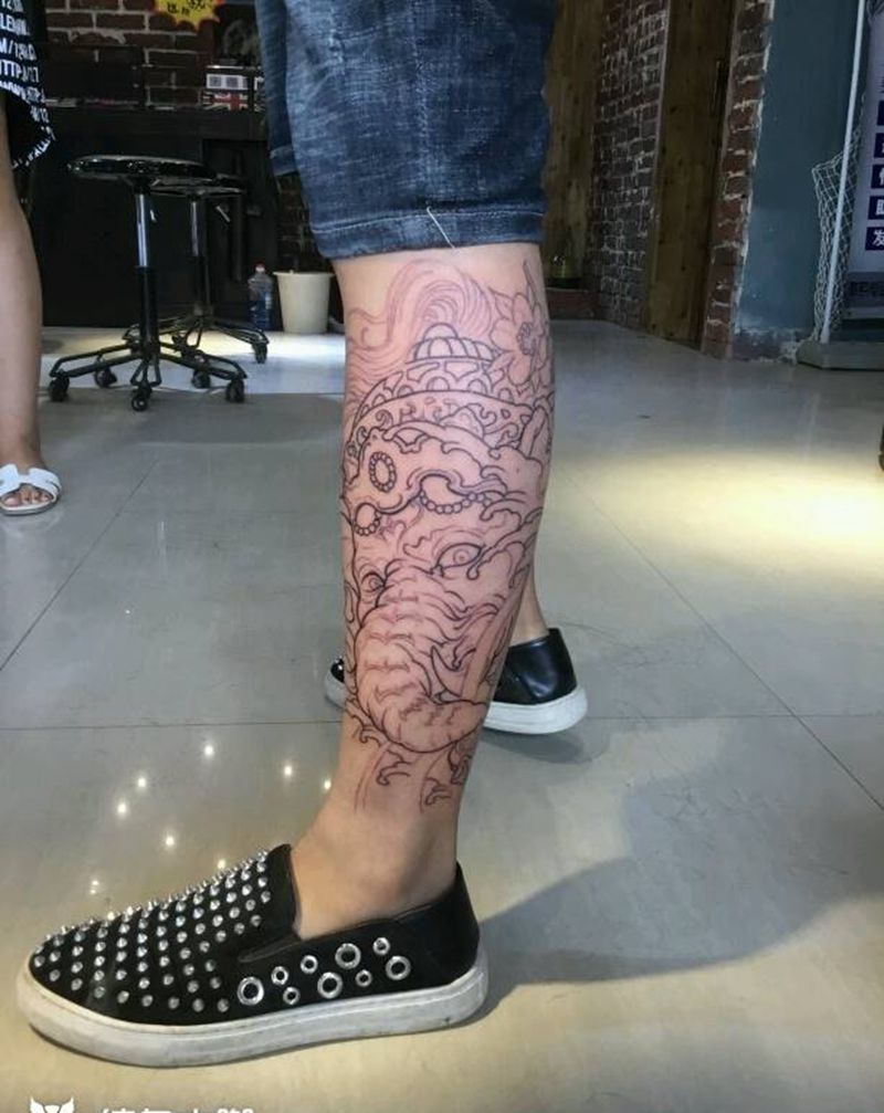 当前位置: 首页 >山东省日照市纹身店-赤焰阁纹身工作室纹身图案>小腿象神纹身图片