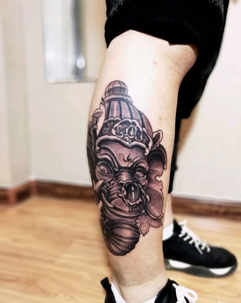 当前位置: 首页 >山东省日照市纹身店-赤焰阁纹身工作室纹身图案>象神纹身图片_腿部新传统象神纹身图案