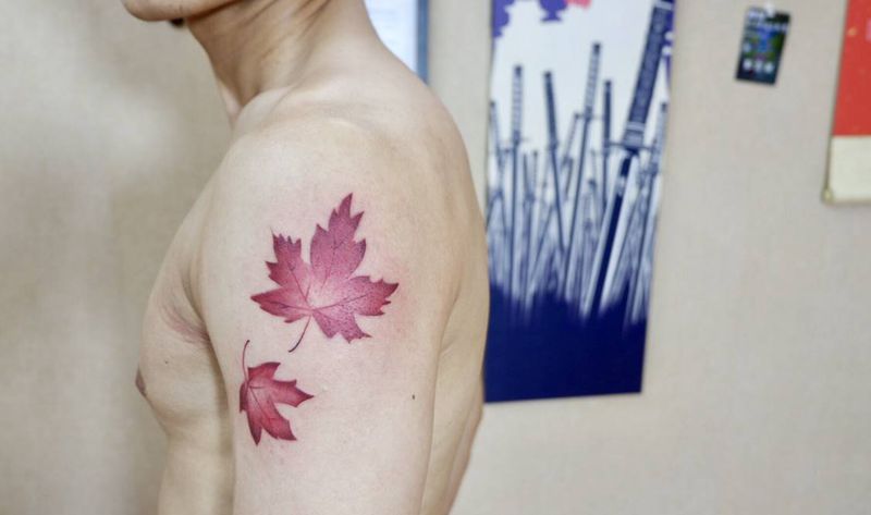 枫叶纹身图片_手臂肩部新传统水彩枫叶纹身图案