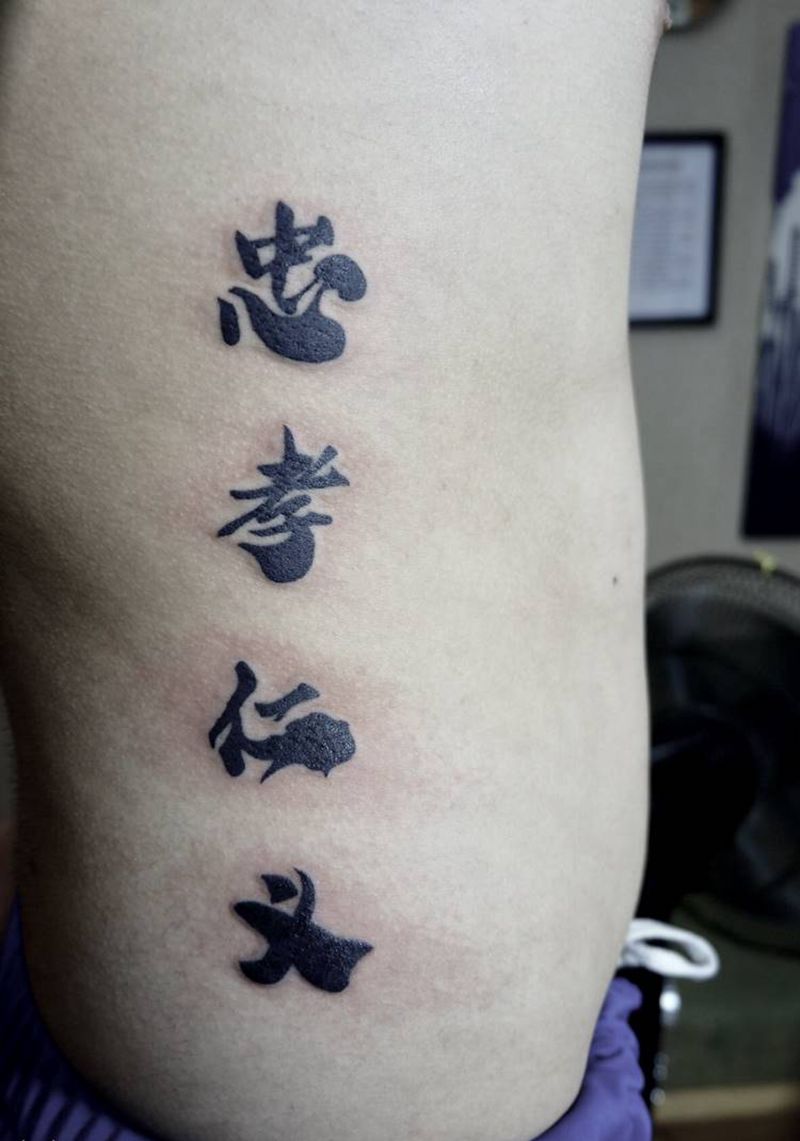 当前位置: 首页 >山东省日照市纹身店-赤焰阁纹身工作室纹身图案>侧腰书法纹身图片_腰部水墨书法忠孝仁义纹身图案