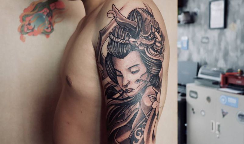 当前位置: 首页 >山东省日照市纹身店-赤焰阁纹身工作室纹身图案>艺妓纹身图片_手臂新传统艺妓纹身图案
