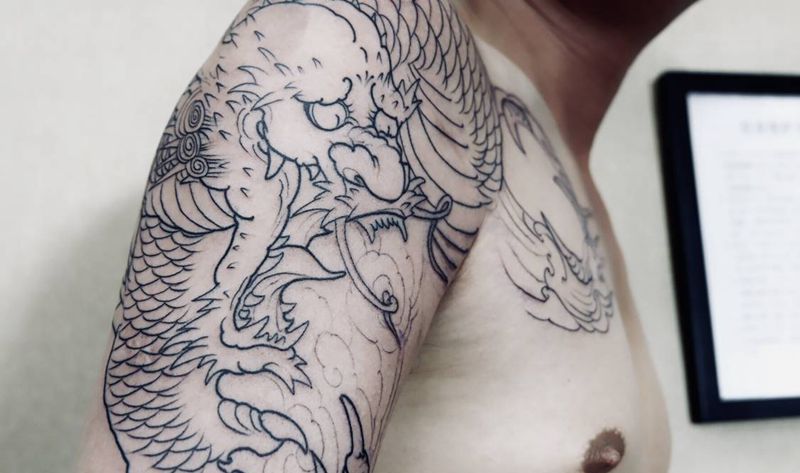 当前位置: 首页 >山东省日照市纹身店-赤焰阁纹身工作室纹身图案>半甲龙纹身图片_手臂胸部新传统龙半甲纹身图案