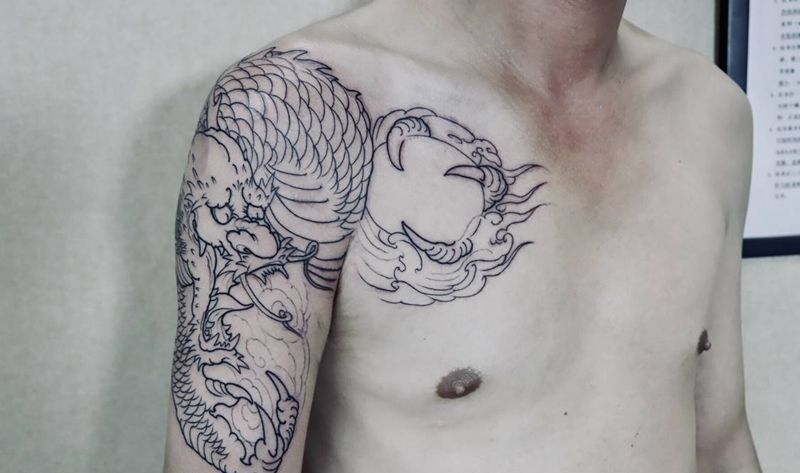 半甲龙纹身图片_手臂胸部新传统龙半甲纹身图案