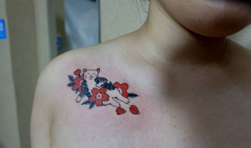 当前位置: 首页 >山东省日照市纹身店-赤焰阁纹身工作室纹身图案>猫纹身图片_肩部老传统猫锁骨纹身图案