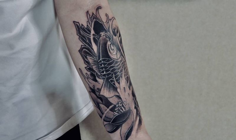 当前位置: 首页 >山东省日照市纹身店-赤焰阁纹身工作室纹身图案>鲤鱼遮盖纹身图片_手臂新传统鱼纹身图案
