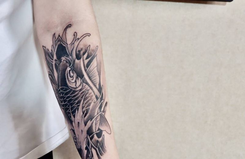 鲤鱼遮盖纹身图片_手臂新传统鱼纹身图案