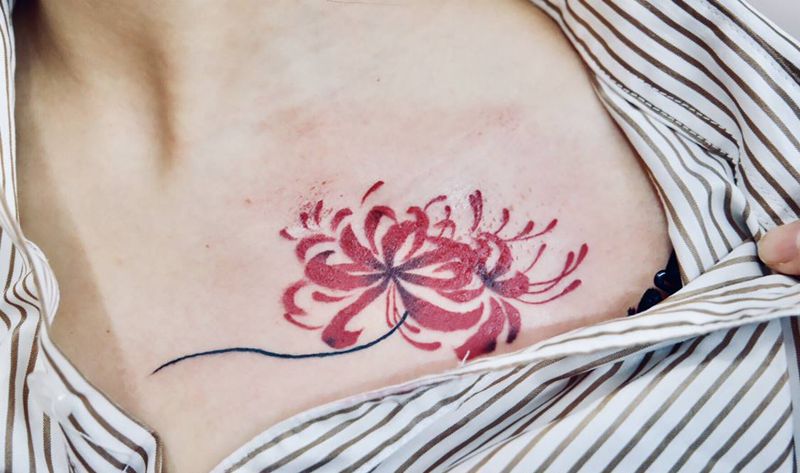 彼岸花纹身图片_肩部胸部新传统彼岸花纹身图案