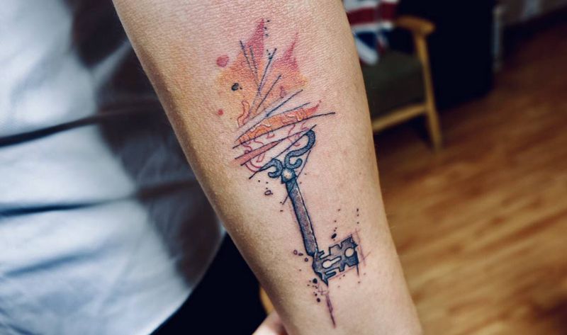 钥匙纹身图片_手臂水彩钥匙纹身图案
