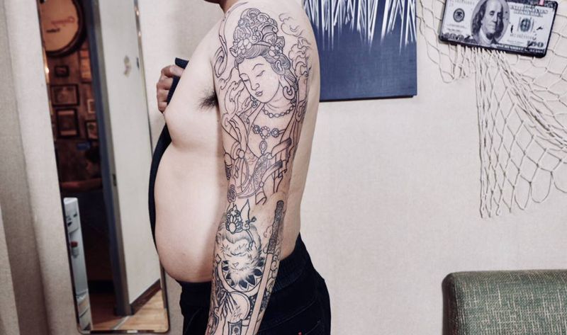 当前位置: 首页 >山东省日照市纹身店-赤焰阁纹身工作室纹身图案>花臂纹身图片_手臂老传统菩萨斗战胜佛纹身图案