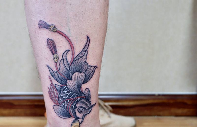 当前位置: 首页 >山东省日照市纹身店-赤焰阁纹身工作室纹身图案>金鱼纹身图片_腿部新传统金鱼纹身图案