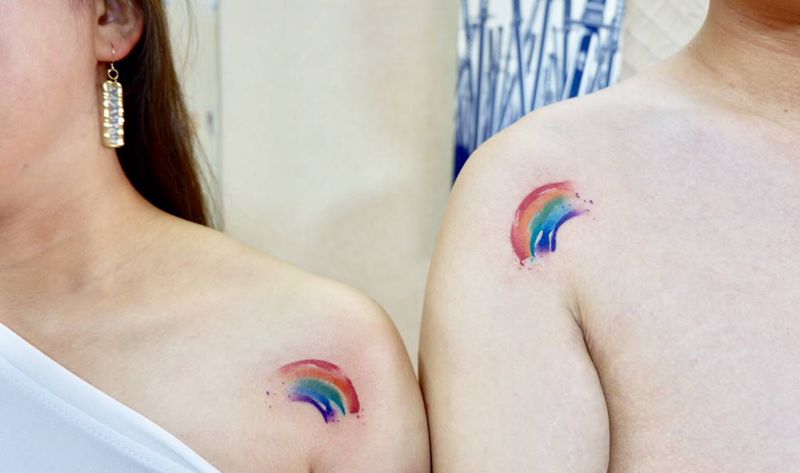 彩虹纹身图片_肩部水彩彩虹情侣纹身图案