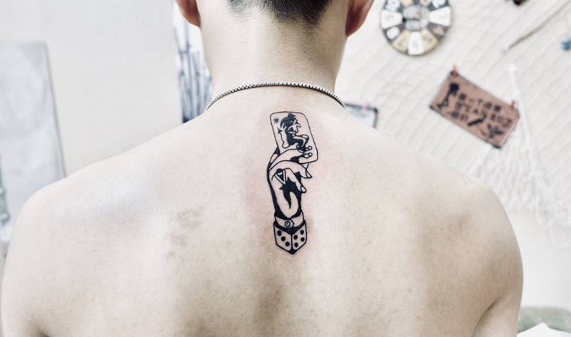 当前位置: 首页 >山东省日照市纹身店-赤焰阁纹身工作室纹身图案>小王纹身图片_背部Old School手扑克纹身图案