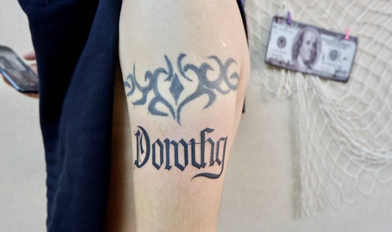 当前位置: 首页 >山东省日照市纹身店-赤焰阁纹身工作室纹身图案>花体字纹身图片_手臂手部花体字纹身图案