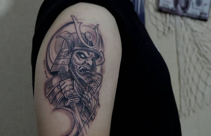 当前位置: 首页 >山东省日照市纹身店-赤焰阁纹身工作室纹身图案>武士纹身图片_手臂新传统武士班若纹身图案