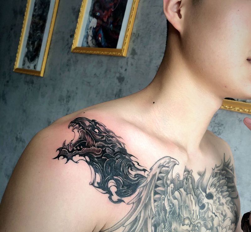 当前位置: 首页 >山东省日照市纹身店-墨龙堂纹身图案>暗黑系遮盖纹身图片_肩部水墨纹身图案
