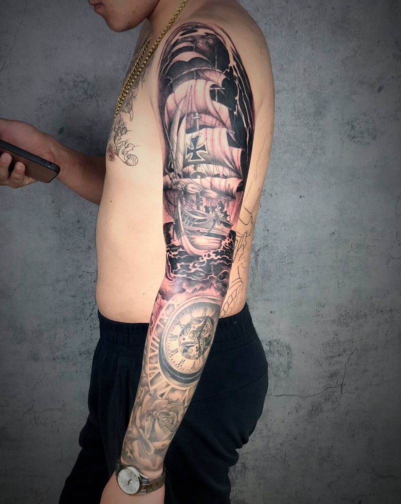 当前位置: 首页 >山东省日照市纹身店-墨龙堂纹身图案>船 时间纹身图片_手臂欧美写实纹身图案