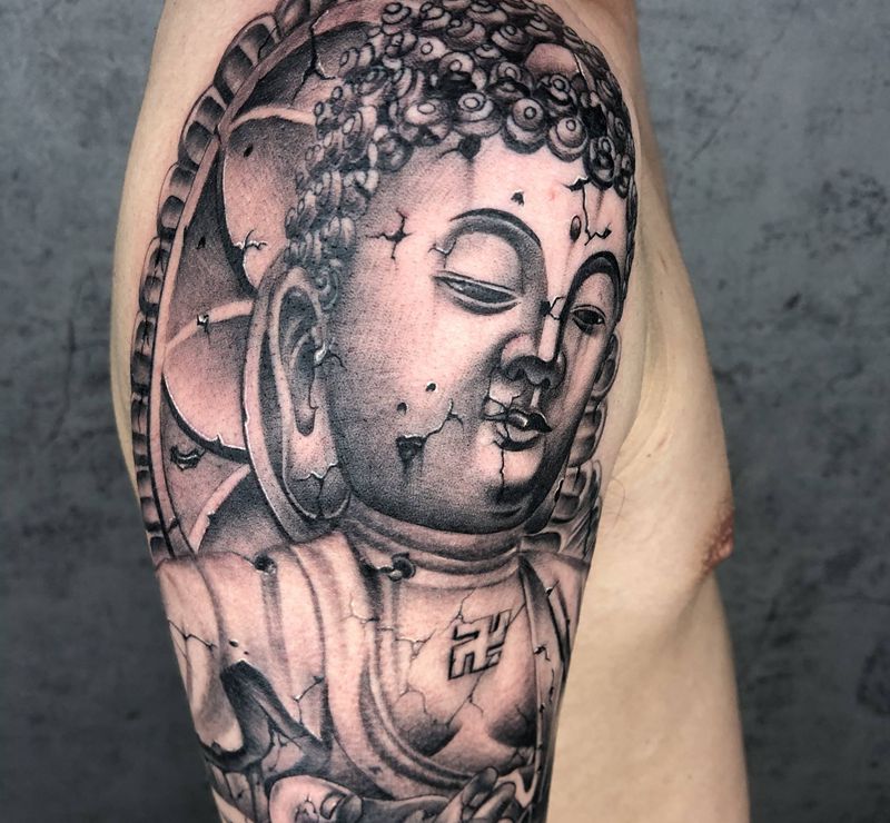 当前位置: 首页 >山东省日照市纹身店-墨龙堂纹身图案>石雕佛像纹身图片_手臂新传统纹身图案