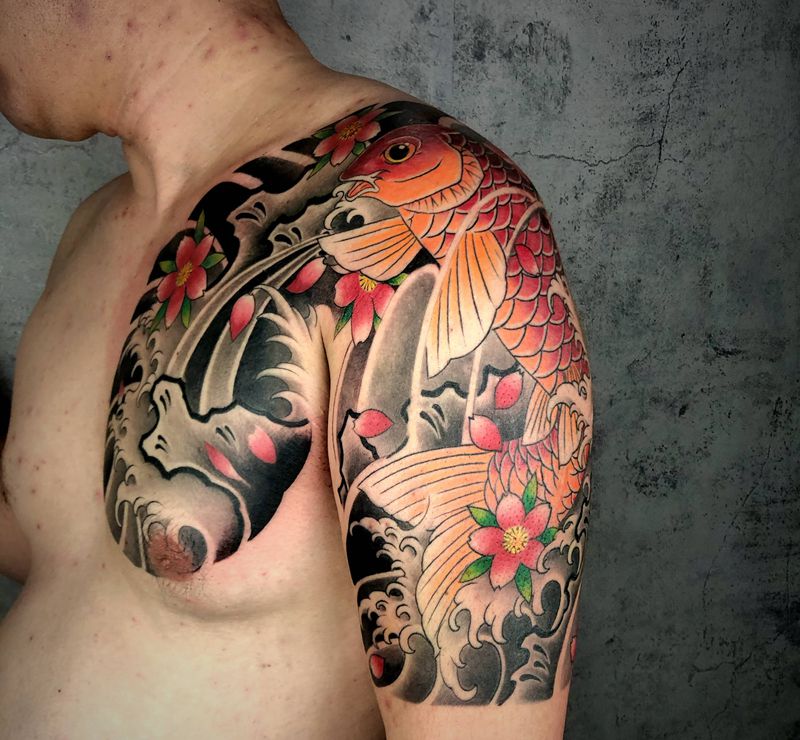 鲤鱼纹身图片_胸部肩部老传统纹身图案