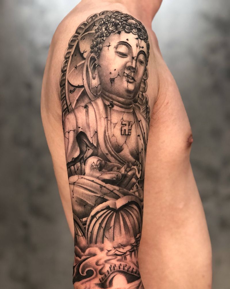 当前位置: 首页 >山东省日照市纹身店-墨龙堂纹身图案>石雕佛像纹身图片_手臂新传统纹身图案