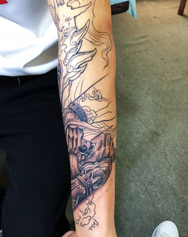 当前位置: 首页 >山东省日照市纹身店-墨龙堂纹身图案>子龙未完成纹身图片_手臂新传统人物纹身图案