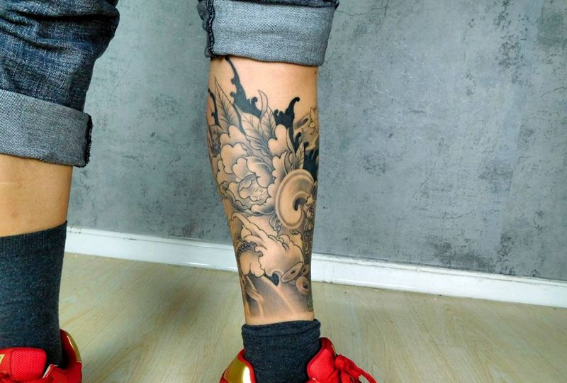 • T网红王老大花腿龙纹身图片_腿部新传统纹身图案