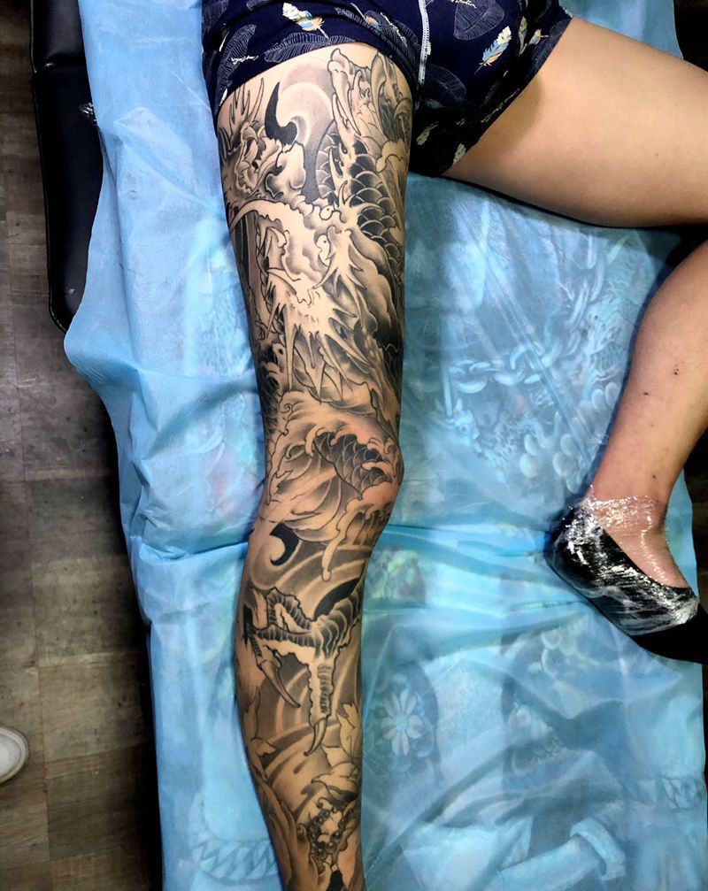 • T网红王老大花腿龙纹身图片_腿部新传统纹身图案