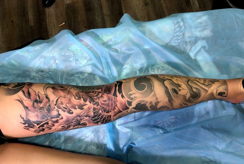 • T网红王老大花腿龙纹身图片_腿部新传统纹身图案