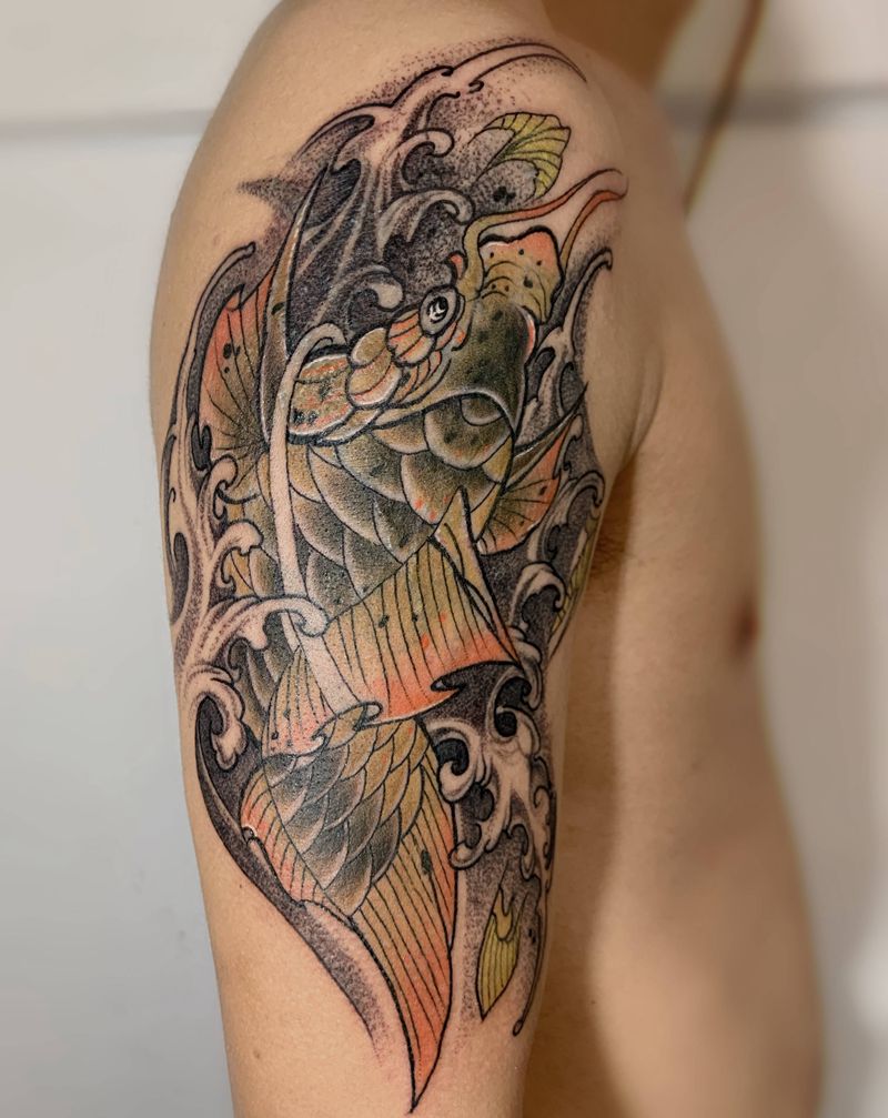当前位置: 首页 >山东省临沂市纹身店-戊戌刺青纹身图案>遮盖图腾,鲤鱼纹身图片_手臂手部新传统纹身图案