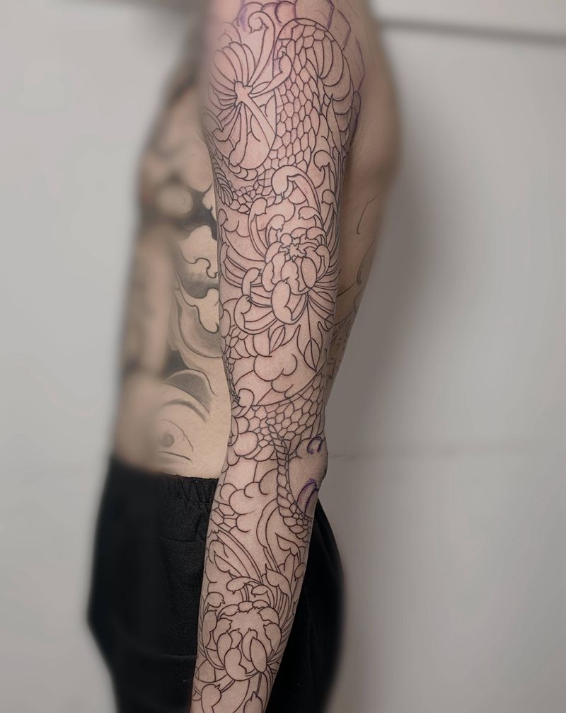 当前位置: 首页 >山东省临沂市纹身店-戊戌刺青纹身图案>日式花臂线条纹身图片_手部纹身图案