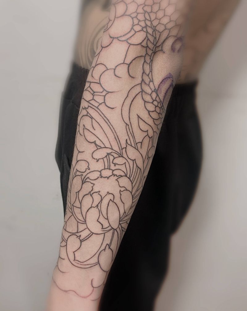 当前位置: 首页 >山东省临沂市纹身店-戊戌刺青纹身图案>日式花臂线条纹身图片_手部纹身图案