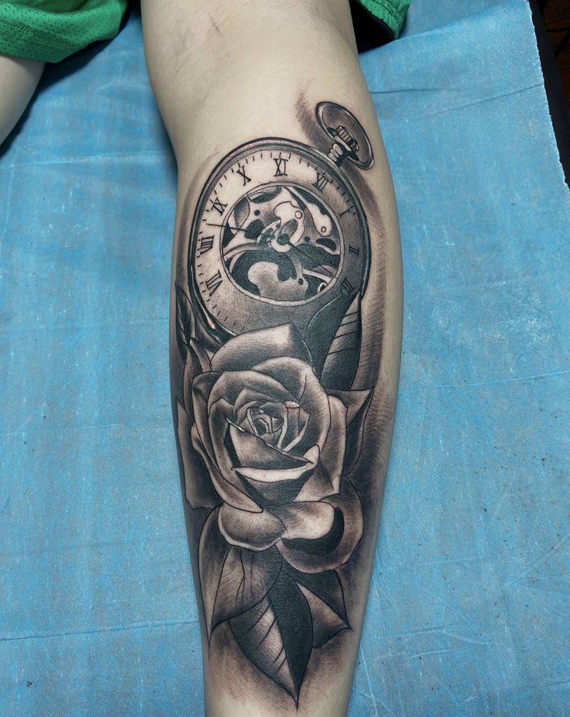 欧美时钟玫瑰纹身图片_腿部欧美写实纹身图案