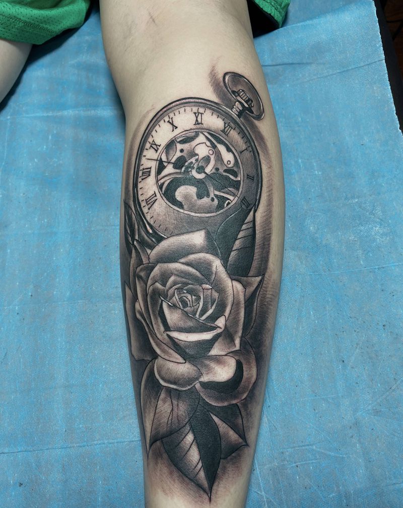 当前位置: 首页 >山东省临沂市纹身店-戊戌刺青纹身图案>欧美时钟玫瑰纹身图片_腿部欧美写实纹身图案