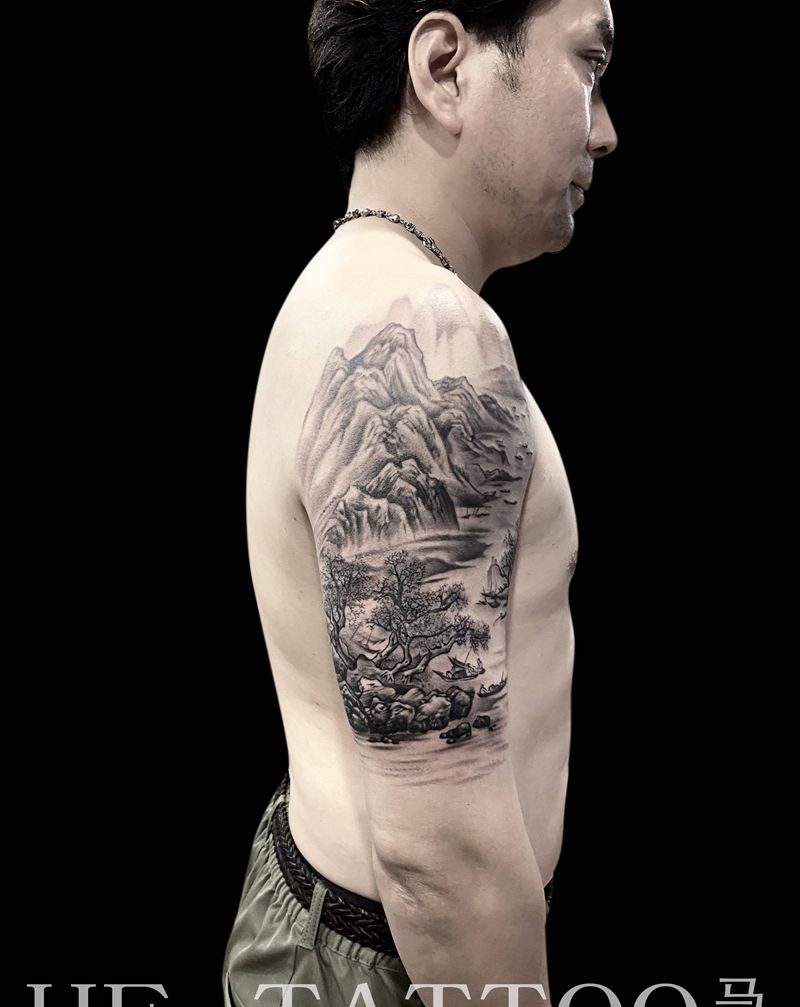 当前位置: 首页 >山东省临沂市纹身店-赫刺青纹身图案>《渔乐图》纹身图片_手臂水墨纹身图案