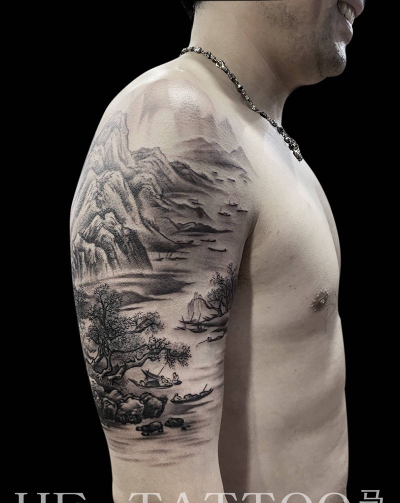 当前位置: 首页 >山东省临沂市纹身店-赫刺青纹身图案>《渔乐图》纹身图片_手臂水墨纹身图案