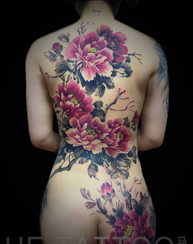 牡丹纹身图片_背部臀部水墨纹身图案