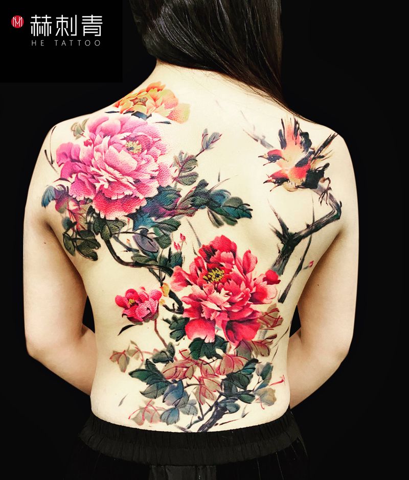 中国风水墨水彩第一名纹身图片_背部水墨水彩牡丹纹身图案