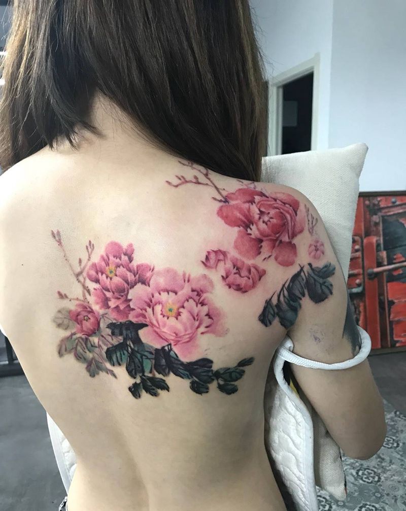 国画风格牡丹纹身图片_背部水墨纹身图案