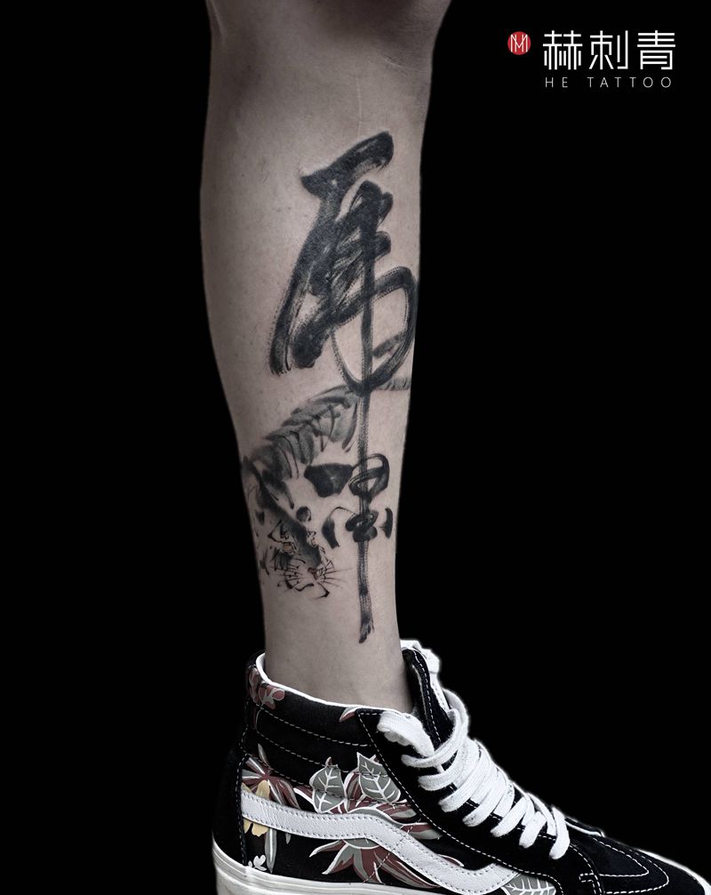 2020书法第二名纹身图片_腿部水墨书法纹身图案