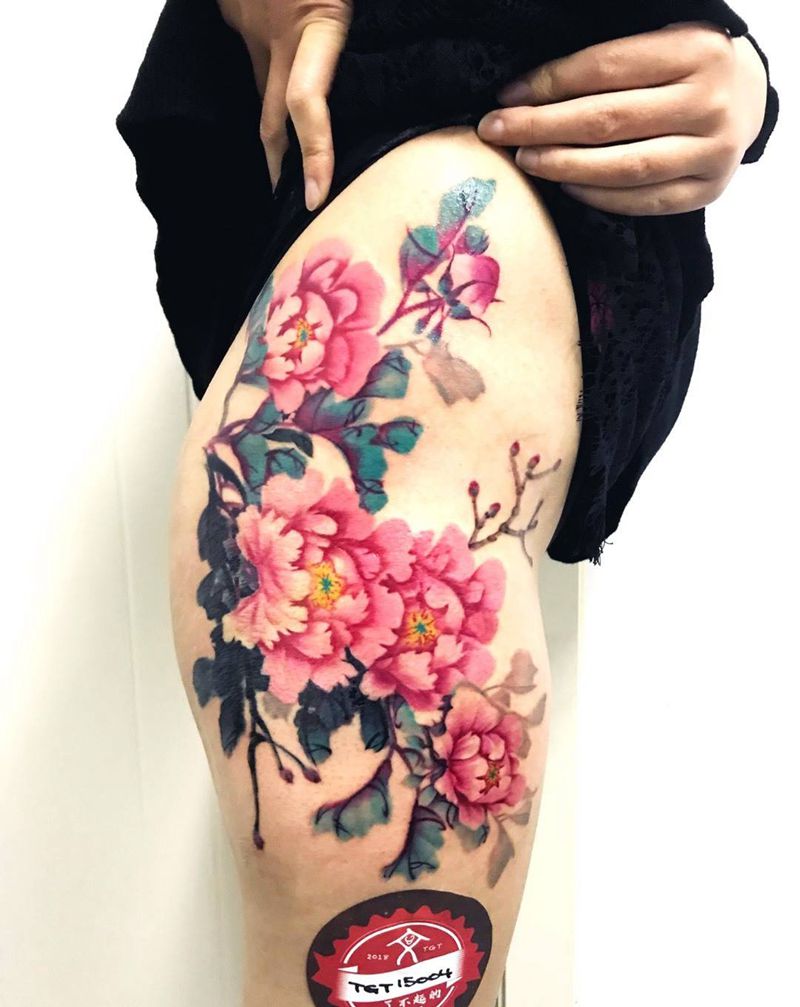 中国风小写意牡丹纹身图片_臀部腿部水墨水彩牡丹纹身图案