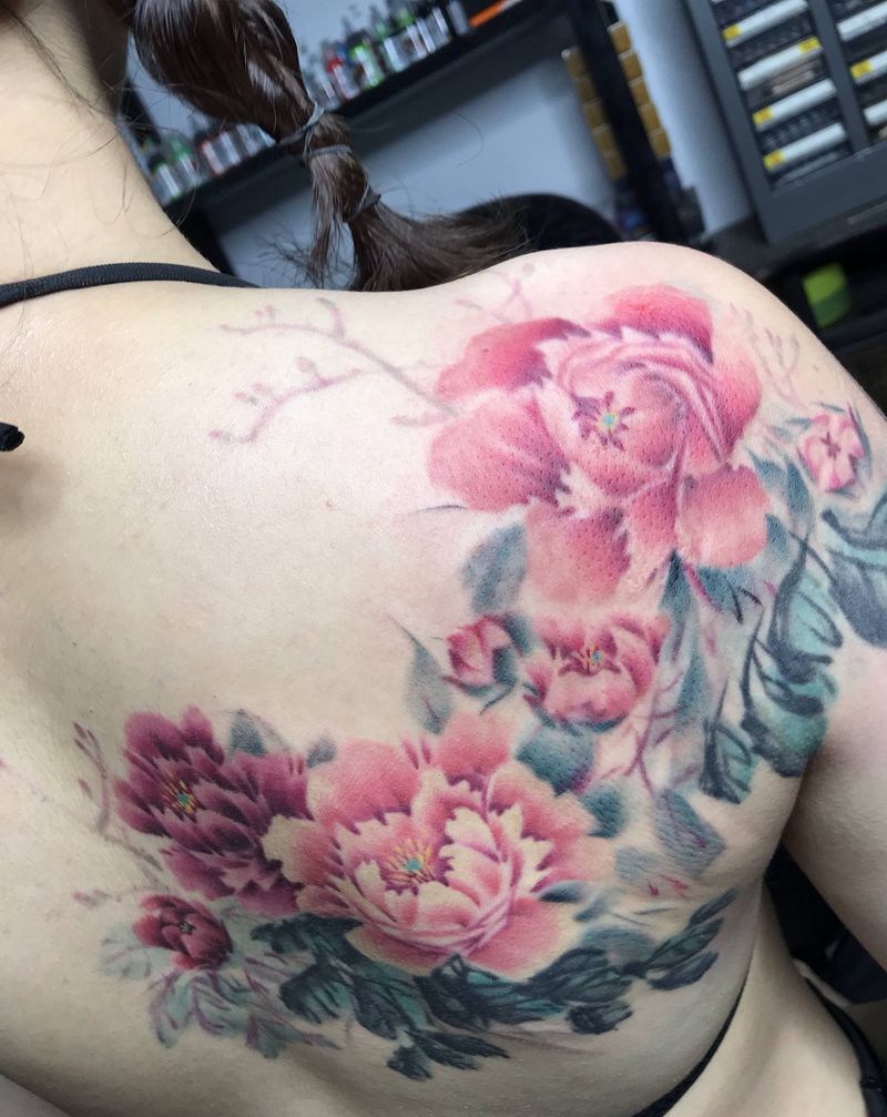 当前位置: 首页 >山东省临沂市纹身店-赫刺青纹身图案>小写意牡丹纹身图片_肩部水墨水彩纹身图案