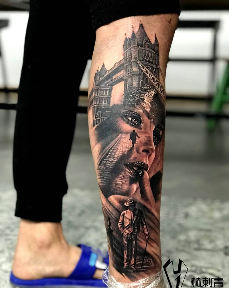 黑灰写实纹身图片_腿部欧美写实纹身图案
