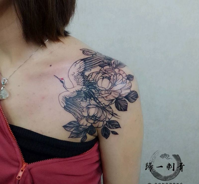 素花,肩花 鹤纹身图片_肩部小清新 素花纹身图案